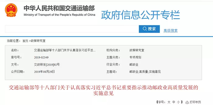 交通运输部等十八部门关于认真落实习近平总书记重要指示推动邮政业高质量发展的实施意见